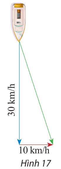 Một con tàu có vectơ vận tốc chỉ theo hướng nam, vận tốc của dòng nước là một vectơ theo hướng đông như hình 17. Tính độ dài vectơ tổng của hai vectơ nói trên.