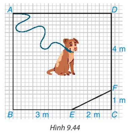Chú cún bị xích bởi một sợi dây dài 6m để canh một mảnh vườn giới hạn bởi các điểm A, B, E, F, D trong hình vuông ABCD có cạnh 5m như Hình 9.44. Đầu xích buộc cố định tại điểm A của mảnh vườn. Hỏi chú cún có thể chạy đến tất cả các điểm của mảnh vườn mình phải canh không?