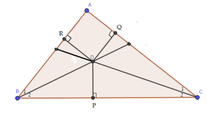 Trong tam giác ABC, hai đường phân giác của các góc B và C cắt nhau tại D. Kẻ DP vuông góc với BC, DQ vuông góc với CA, DR vuông góc với AB.