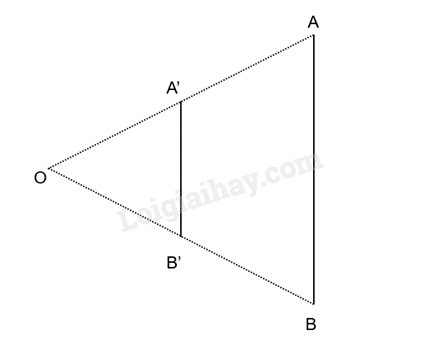 Trên các tia OA, OB lấy các điểm A’, B’ sao cho OA’ = $\frac{1}{2}$ OA, OB’ = $\frac{1}{2}$OB (hay A’, B’ lần lượt là trung điểm của các đoạn thẳng OA, OB). Khi đó đoạn thẳng A’B’ là hình đồng dạng phối cảnh của đoạn thẳng AB với tâm phối cảnh O và tỉ số đồng dạng $\frac{1}{2}$.