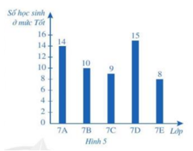 Một trường trung học cơ sở có các lớp 7A, 7B, 7C, 7D, 7E; mỗi lớp đều có 40 học sinh. Sau khi sơ kết Học kì I, số học sinh ở mức Tốt của mỗi lớp đó được thể hiện qua biểu đồ cột ở Hình 5 .