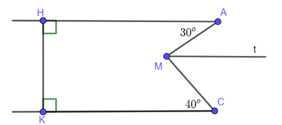 \(\widehat {AMB} = \widehat {AMt} + \widehat {BMt} = {30^o} + {40^o} = {70^o}\)