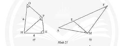 a) Trong Hình 21a, cho biết \(\widehat {HOP} = \widehat {HPE},\widehat {HPO} = \widehat {HEP},OH = 6cm\) và \(HE = 4cm\). Tính độ dài đoạn thẳng \(HP\).