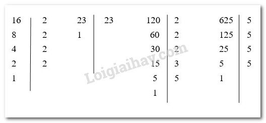 Phân tích các số sau ra thừa số nguyên tố: 16, 23, 120, 625.