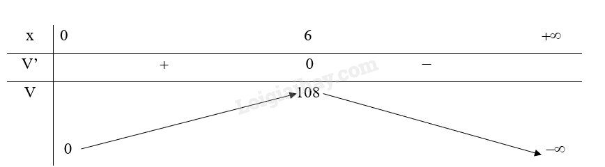 Ta có: \(V’ = \frac{{ – 3{x^2} + 108}}{4},V’ = 0 \Leftrightarrow x = 6\) (do \(x > 0\))