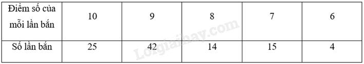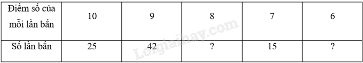 Gọi số lần bắn đạt 8 điểm là x (lần), số lần bắn đạt 6 điểm là y (lần), từ đề bài có tổng 100 lần bắn nên ta có \(25 + 42 + x + 15 + y = 100\)