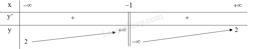 Hàm số đồng biến trên khoảng \(\left( { – \infty ; – 1} \right)\) và \(\left( { – 1; + \infty } \right)\).