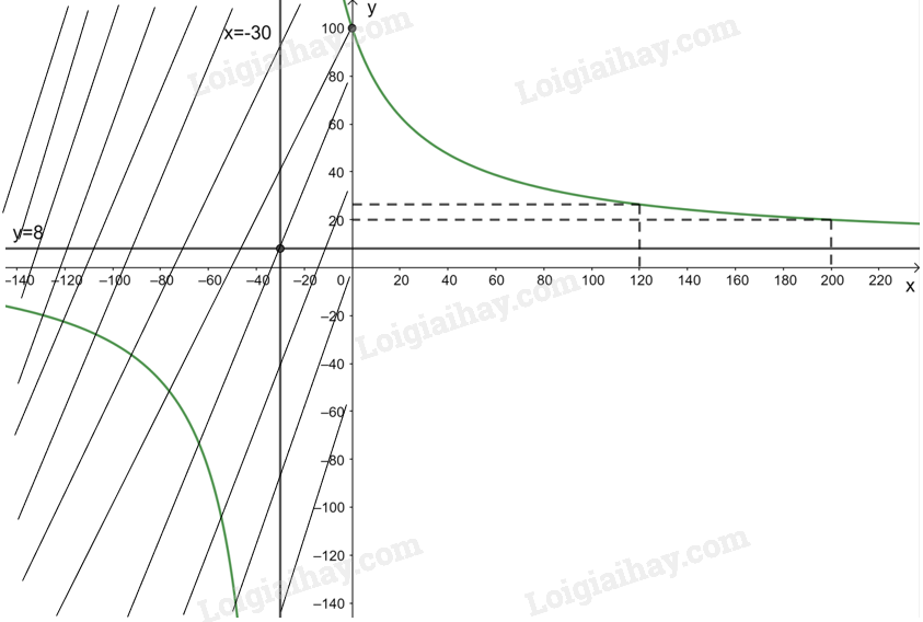 Đồ thị hàm số \(y = C\left( x \right) = \frac{{8x + 3000}}{{x + 30}}\) đi qua các điểm (200; 20); \(\left( {120;\frac{{132}}{5}} \right)\).