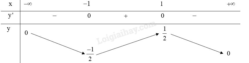Ta có: \(y’ = \frac{{\left( {{x^2} + 1} \right) – 2x.x}}{{{{\left( {{x^2} + 1} \right)}^2}}} = \frac{{{x^2} + 1 – 2{x^2}}}{{{{\left( {{x^2} + 1} \right)}^2}}} = \frac{{ – {x^2} + 1}}{{{{\left( {{x^2} + 1} \right)}^2}}},y’ = 0 \Leftrightarrow \frac{{ – {x^2} + 1}}{{{{\left( {{x^2} + 1} \right)}^2}}} = 0 \Leftrightarrow \left[ \begin{array}{l}x = 1\\x =  – 1\end{array} \right.\)
