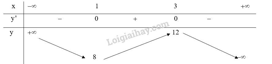 Hàm số đạt cực đại tại \(x = 3\), giá trị cực đại . Hàm số đạt cực tiểu tại \(x = 1\), giá trị cực tiểu \({y_{CT}} = 8\)