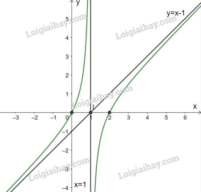 Do đó, đồ thị hàm số nhận đường thẳng \(x = 1\) làm tiệm cận đứng và đường thẳng \(y = x – 1\) làm tiệm cận xiên.