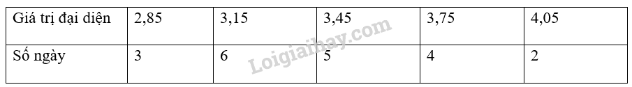 Ta có: \[{x_1}; \ldots ;{\rm{ }}{x_3} \in [2,7;3,0)\]; \[{x_4}; \ldots ;{\rm{ }}{x_9} \in [3,0;3,3)\];\[{x_{10}}; \ldots ;{\rm{ }}{x_{14}} \in [3,3;3,6)\];\[{x_{15}}; \ldots ;{\rm{ }}{x_{18}} \in [3,6;3,9)\];\[{x_{19}};{\rm{ }}{x_{20}} \in [3,9;4,2)\]