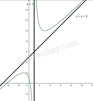\(a = \mathop {\lim }\limits_{x \to  + \infty } \frac{{{x^2} + 4x – 1}}{{{x^2} – x}} = 1;b = \mathop {\lim }\limits_{x \to  + \infty } (\frac{{{x^2} + 4x – 1}}{{x – 1}} – x) = 5\) nên y = x + 5 là tiệm cận xiên của đồ thị hàm số