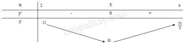 Từ bảng biến thiên, ta thấy \(\mathop {\min }\limits_{[2;4]} y = y(3) = 10\) và \(\mathop {\max }\limits_{[2;4]} y = y(2) = 11\)