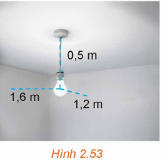 Hình 2.53 minh họa một chiếc đèn được treo cách trần nhà 0,5m, cách hai tường lần lượt là 1,2m và 1,6m. Hai bức tường vuông góc với nhau và cùng vuông góc với trần nhà. Người ta di chuyển chiếc đèn đó đến vị trí mới cách trần nhà là 0,4m, cách hai tường đều là 1,5m. a) Lập một hệ trục tọa độ Oxyz phù hợp và xác định tọa độ của bóng đèn lúc đầu và sau khi di chuyển. b) Vị trí mới của bóng đèn cách vị trí ban đầu là bao nhiêu mét? (Làm tròn kết quả đến chữ số thập phân thứ nhất).