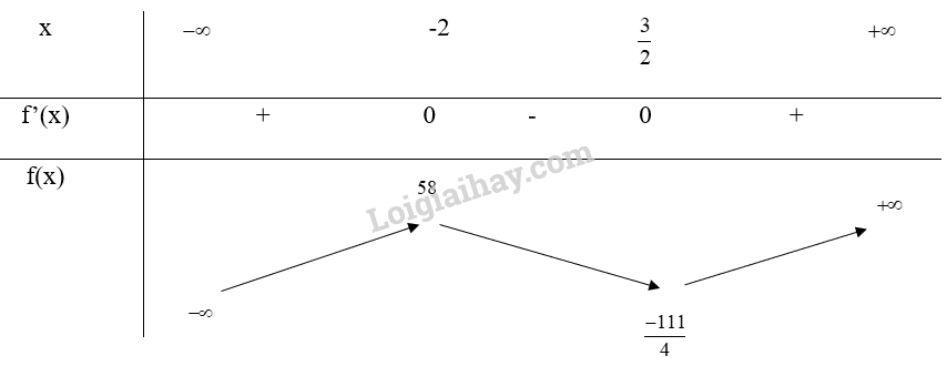 Hàm số đạt cực đại tại x = -2, \({y_{cd}} = f( – 2) = 58\), đạt cực tiểu tại x = \(\frac{3}{2}\), \({y_{ct}} = f(\frac{3}{2}) =  – \frac{{111}}{4}\)
