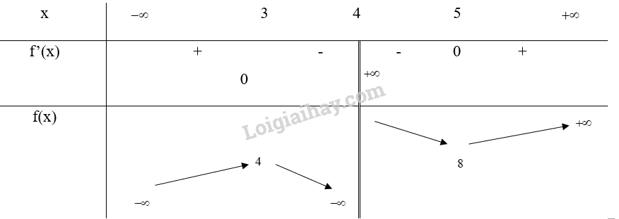 Hàm số đồng biến trên khoảng (\( – \infty \);3) và (8;\( + \infty \)), nghịch biến trên khoảng (3;4) và (4;5)