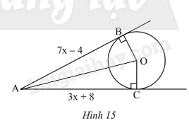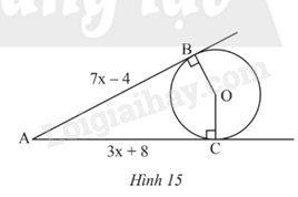 Quan sát Hình 15. Biết AB, AC lần lượt là tiếp tuyến của đường tròn (O) tại B, C. Tính giá trị của x.