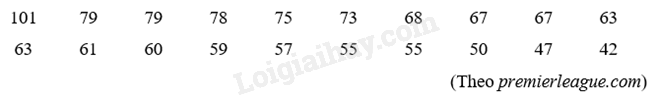Cỡ mẫu \(n = 20\). Giả sử \({x_1},{x_2},…,{x_{20}}\) là số thẻ vàng mà mỗi câu lạc bộ ngoại hạng Anh nhận được mùa giải 2021- 2022, các giá trị này đã được sắp xếp theo thứ tự không giảm.