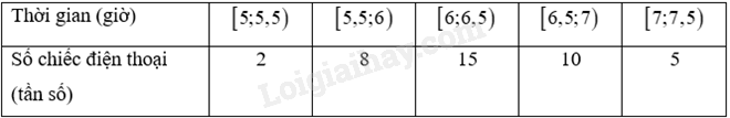 Thời gian trung bình nghe nhạc liên tục của điện thoại là: \(\overline x  = \frac{1}{{40}}\left( {5,25.2 + 5,75.8 + 6,25.15 + 6,75.10 + 7,25.5} \right) = 6,35\)