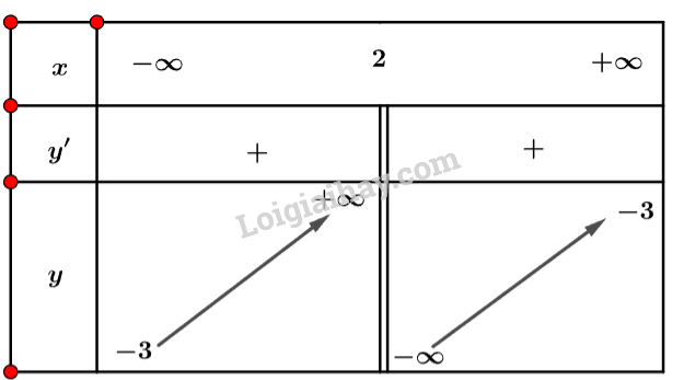 Vậy hàm số đồng biến trên khoảng \(\left( { – \infty ;2} \right)\) và \(\left( {2; + \infty } \right)\).