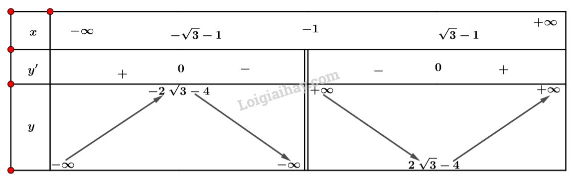 Vậy hàm số đồng biến trên khoảng \(\left( { – \infty ; – 1 – \sqrt 3 } \right)\) và \(\left( { – 1 + \sqrt 3 ; + \infty } \right)\) và nghịch biến trên khoảng \(\left( { – 1 – \sqrt 3 ; – 1} \right)\) và \(\left( { – 1; – 1 + \sqrt 3 } \right)\).