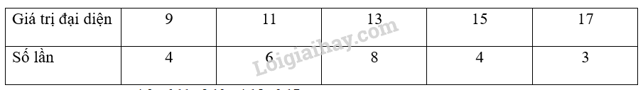 Số trung bình: \(\overline x  = \frac{{4.9 + 6.11 + 8.13 + 4.15 + 3.17}}{{25}} = 12,68\)