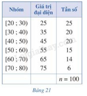 Bảng 21 biểu diễn mẫu số liệu ghép nhóm về độ tuổi của cư dân trong một khu phố. Tính phương sai và độ lệch chuẩn của mẫu số liệu đó.