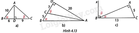 Tính tỉ số lượng giác của các góc \(\alpha \) và \(\beta \) trong mỗi trường hợp ở Hình 4.13.