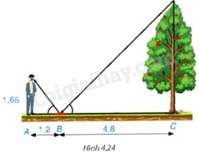 Một người đứng tại điểm A, cách gương phẳng đặt nằm trên mặt đất tại điểm B là 1,2 m, nhìn thấy hình phản chiếu qua gương B của ngọn cây (cây có gốc ở tại điểm C cách B là 4,8 m, B nằm giữa A và C). Biết khoảng cách từ mặt đất đến mắt người đó là 1,65 m. Tính chiều cao của cây (H.4.24).