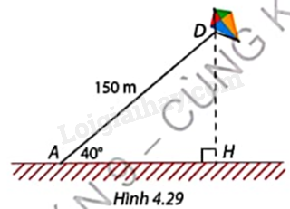Trong Hình 4.29, một cánh diều được thả trên bầu trời với chiều dài dây là \(AD = 150m\), góc tạo bởi dây diều và phương nằm ngang là \(\widehat {DAH} = {40^o}\). Tính độ cao DH của cánh diều so với mặt đất.