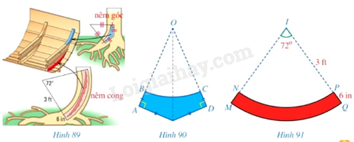 Khi đóng đáy thuyền cho những con thuyền vượt biển, người Vikigns sử dụng hai loại nêm: nêm góc và nêm cong (lần lượt tô màu xanh, màu đỏ trong Hình 89). Mặt cắt \(ABCD\) của nêm góc có dạng hai tam giác vuông \(OAE,ODE\) bằng nhau với cạnh huyền chung và bỏ đi hình quạt tròn \(OBC\)(Hình 90), được làm từ những thân cây mọc thẳng. Mặt cắt \(MNPQ\) của nêm cong có dạng một phần của hình vành khuyên (Hình 91), được làm từ những thân cây cong. Kích thước của nêm cong được cho như ở Hình 91.