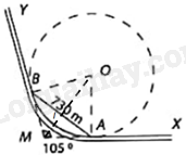 Trong Hình 5.42, để tàu không trật bánh ray khi chuyển hướng từ đường ray thẳng XA sang đường ray thẳng YB, đoạn ray nối được thiết kế là một phần của đường tròn (O) tiếp xúc với XA tại A và BY tại B. Biết góc chuyển hướng của tàu là \(\widehat {AMB} = {105^o}\) và khoảng cách giữa hai điểm A và B là 730m. Tính bán kính của đường tròn (O). Làm tròn kết quả đến đơn vị mét.