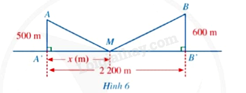 Có hai xã A, B cùng ở một bên bờ sông Lam, khoảng cách từ hai xác đó đến bờ sông lần lượt là \(AA’ = 500m,BB’ = 600m\) và người ta đo dược \(A’B’ = 2200m\). Các kĩ sư muốn xây một trạm cung cấp nước sạch nằm bên bờ sông Lam cho người dân hai xã. Giả sử vị trí của trạm cung cấp nước sạch đó là điểm M trên đoạn \(A’B’\) với \(MA’ = x\left( m \right)\), \(0 < x < 2200\) (minh họa ở Hình 6).