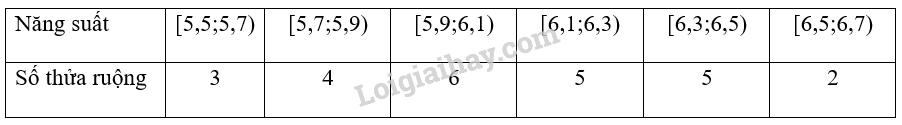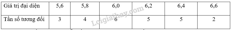 Ta có: \({x_1}; \ldots ;{\rm{ }}{x_3} \in [5,5;5,7)\); \({x_4}; \ldots ;{\rm{ }}{x_7} \in [5,7;5,9)\);\({x_8}; \ldots ;{\rm{ }}{x_{13}} \in [5,9;6,1)\);\({x_{14}};…;{x_{18}} \in [6,1;6,3)\);\({x_{19}};…;{x_{23}} \in [6,3;6,5)\);\({x_{24}};{x_{25}} \in [6,5;6,7)\)