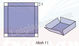 Bạn Việt muốn dùng tấm bìa hình vuông cạnh 6dm làm một chiếc hộp không nắp, có đáy là hình vuông bằng cách cắt bỏ đi 4 hình vuông nhỏ ở bốn góc của tấm bìa (Hình 11). Bạn Việt muốn tìm độ dài cạnh hình vuông cần cắt bỏ để chiếc hộp đạt thể tích lớn nhất. a) Hãy thiết lập hàm số biểu thị thể tích hộp theo x với x là độ dài cạnh hình vuông cần cắt đi. b) Khảo sát và vẽ đồ thị hàm số tìm được. Từ đó, hãy tư vấn cho bạn Việt cách giải quyết vấn đề và giải thích vì sao cần chọn giá trị này. (Làm