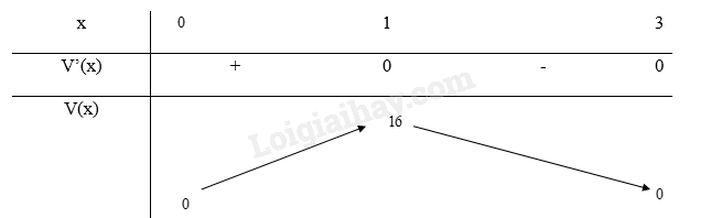 Trên các khoảng (0; 1), (3; \( + \infty \)) thì V'(x) > 0 nên hàm số đồng biến trên mỗi khoảng đó. Trên khoảng (1; 3) thì V'(x) < 0 nên hàm số nghịch biến trên khoảng đó.