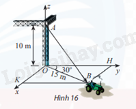 Một chiếc xe đang kéo căng sợi dây cáp AB trong công trường xây dựng, trên đó đã thiết lập hệ toạ độ Oxyz như Hình 16 với độ dài đơn vị trên các trục toạ độ bằng 1 m. Tìm toạ độ của vectơ \(\overrightarrow {AB} \)