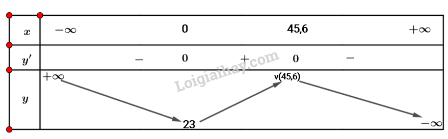 Nhận xét \(a\left( t \right) = v’\left( t \right) = 0 \Leftrightarrow \left[ \begin{array}{l}t = 0\\t \approx 45,6\end{array} \right.\).