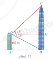 Từ vị trí \(A\) ở phía trên một tòa nhà có chiều cao \(AD = 68m\), bác Duy nhìn thấy vị trí \(C\) cao nhất của một tháp truyền hình, góc tạo bởi tia \(AC\) và tia \(AH\) theo phương nằm ngang là \(\widehat {CAH} = 43^\circ \). Bác Duy cũng nhìn thấy chân tháp tại vị trí \(B\) mà góc tạo bởi tia \(AB\) và tia \(AH\) là \(\widehat {BAH} = 28^\circ \), điểm \(H\) thuộc đoạn \(BC\) (Hình 27). Tính khoảng cách \(BD\) từ chân tháp đến chân tòa nhà và chiều cao \(BC\) của tháp truyền hình (làm tròn kết