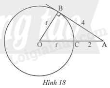 Trong Hình 18, AB là tiếp tuyến của đường tròn (O) tại B. a) Tính bán kính r của đường tròn (O). b) Tính chiều dài cạnh OA của tam giác ABO.