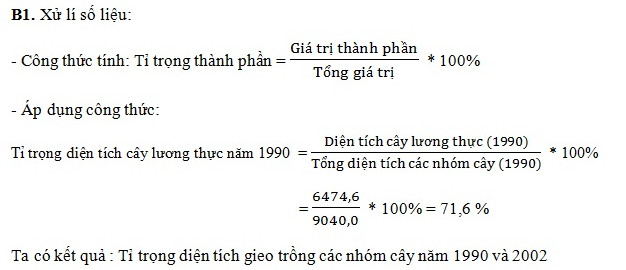 b)Từ bảng số liệu và biểu đồ đã vẽ, hãy nhận xét về sự thay đổi quy mô diện tích và tỉ trọng diện tích gieo trồng của các nhóm cây.