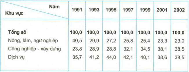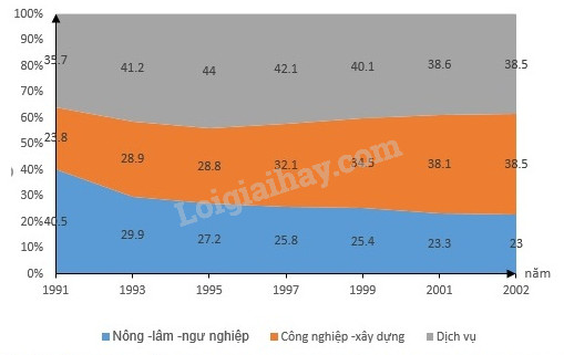 Biếu đồ cơ cấu GDP các ngành kinh tế nước ta, thời kì 1991 – 2002 (%)