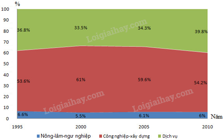 b) Qua biểu đồ, kết hợp với vốn kiến thức của bản thân, nêu nhận xét về sự chuyển dịch cơ cấu kinh tế của vùng Đông Nam Bộ, thời kì 1995 – 2010.