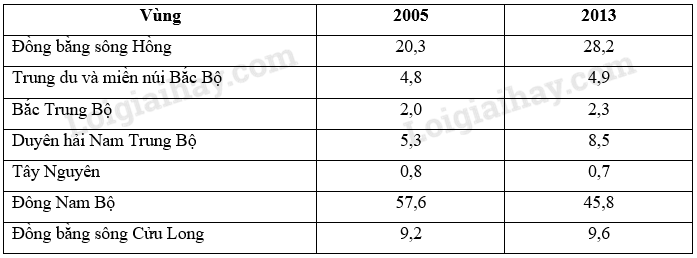 CƠ CẤU GIÁ TRỊ SẢN XUẤT CÔNG NGHIỆP PHÂN THEO VÙNG CỦA NƯỚC TA NĂM 2005 VÀ NĂM 2013 (Đơn vị: %)