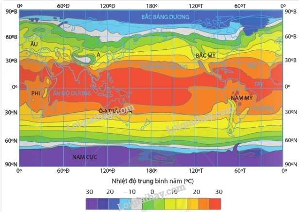 => Nhiệt độ trung bình năm trên bề mặt Trái Đất cao nhất ở khu vực xích đạo.