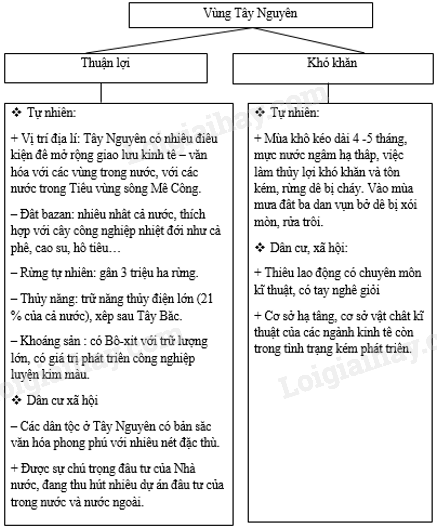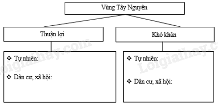 Hoàn thành sơ đồ dưới đây, nêu rõ thuận lợi và khó khăn về điều kiện tự nhiên và điều kiện kinh tế – xã hội của Tây Nguyên khi xây dựng và phát triển kinh tế.