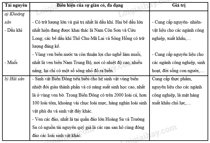 Bằng kiến thức đã học, hãy hoàn thành bảng sau để thể hiện sự đa dạng, giàu có và giá trị của tài nguyên biển.