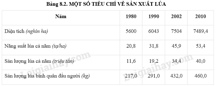 – Về diện tích lúa có sự biến động tăng từ 5600 nghìn ha (1980) lên 7504 nghìn ha (năm 2002), tuy nhiên có sự giảm nhẹ đến năm 2010 là 7489,4 nghìn ha.