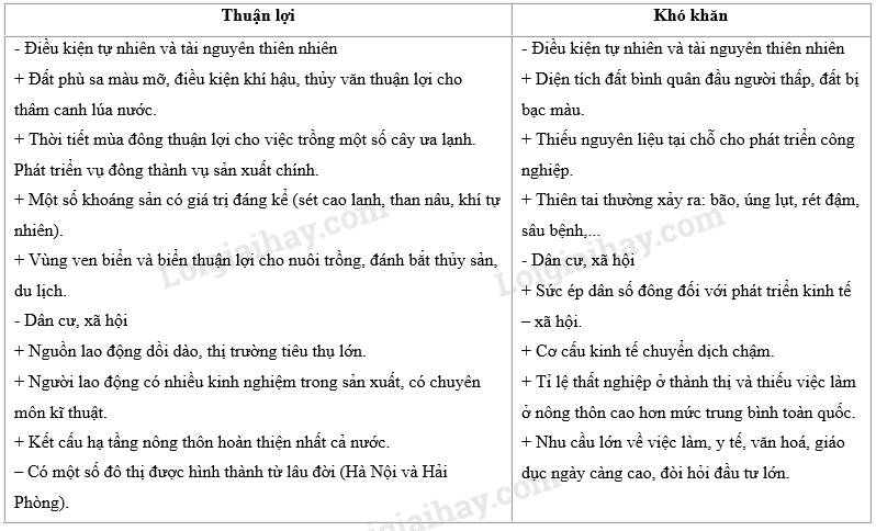 Giải câu 3 trang 49 SBT địa 9, Những thuận lợi, khó khăn trong phát triển kinh tế của đồng bằng sông Hồng.